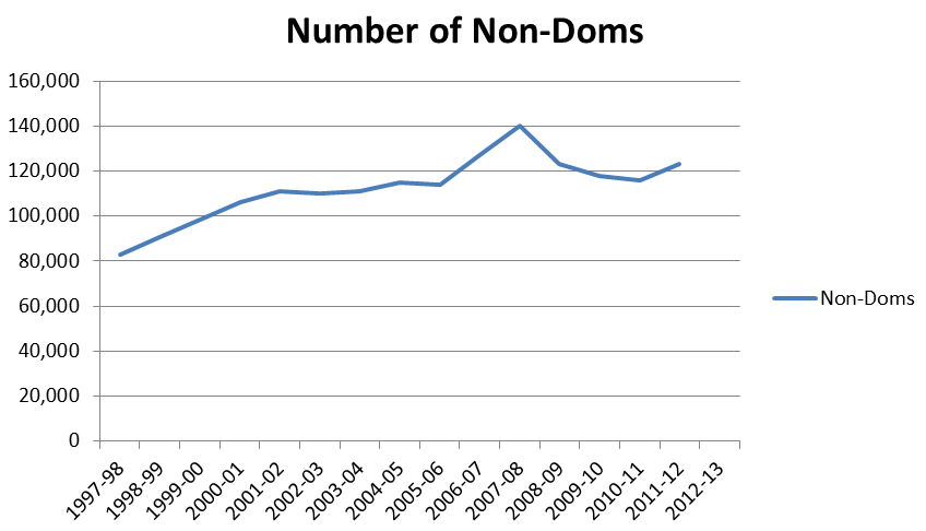 The non-dom levy was introduced in the tax year 2008-09. The number registered as Non Dom then in the country was 123,000. The number registered as Non Dom for the last available year (2011-12) is… 123,000.