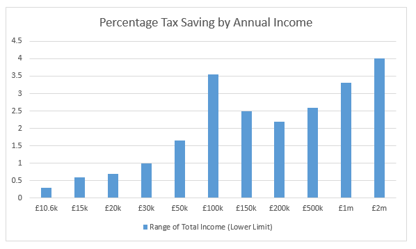 There are 5,000 taxpayers earning more than £2,000,000 per annum. They earn aggregate income of £23.8 bn. And they pay aggregate tax of £9.43bn. This gives an average rate of tax of 39.7%. The average taxpayer in that bracket has income of £4.76m per annum. Pre-reliefs, that taxpayer would pay income tax of £2,128,143 (a blended rate of 44.7%). 44.7% – 1% (dividend effect) – 39.7% = 4%. 4% of £4,760,000 = £190,400.