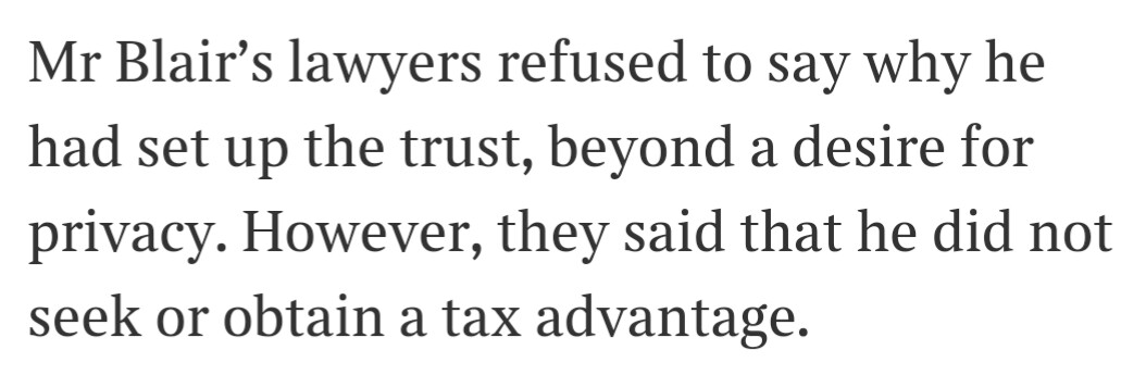 A week or so ago Alexi Mostrous, the Times journalist who has made so many of these stories his own, wrote about Tony Blair’s rather complex personal finances. Those arrangements were said to be set up for reasons of privacy: